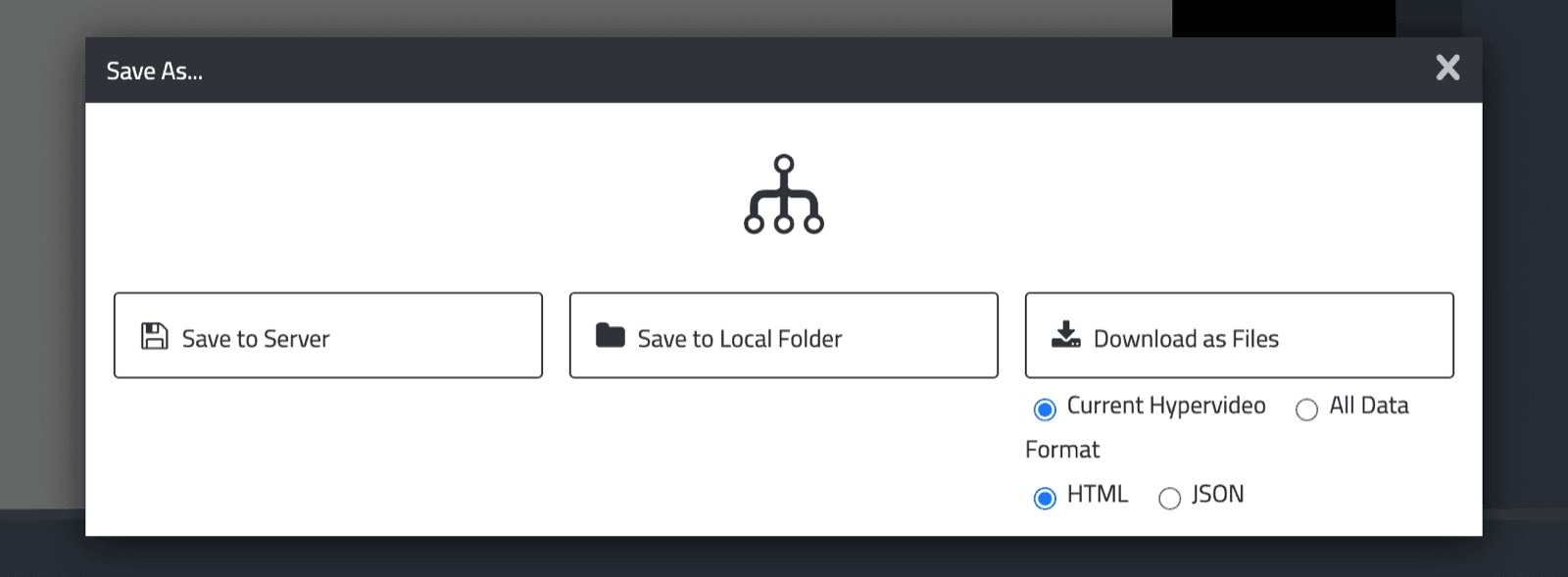 The Save As button is available in every storage mode — even when FrameTrail is running on a server. It opens a dialog with three columns representing the three possible destinations: